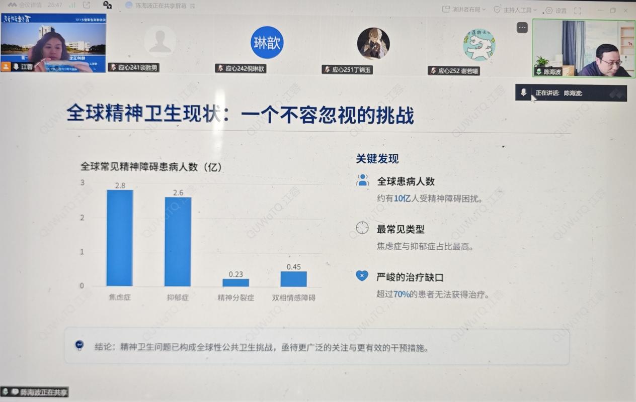 讲座过程中,陈院长通过生动案例与实时互动,将理论知识与临床实践紧密结合,极大地激发了学生的兴趣与思考。在社会快速发展的今天,精神卫生已成为关乎全民福祉的公共议题,对于心理学专业学生而言,掌握相关知识不仅是学业所需,更是未来从事心理健康与社会服务工作的必备基础。同学们纷纷表示受益匪浅,对精神卫生领域有了更系统、更直观的认识。