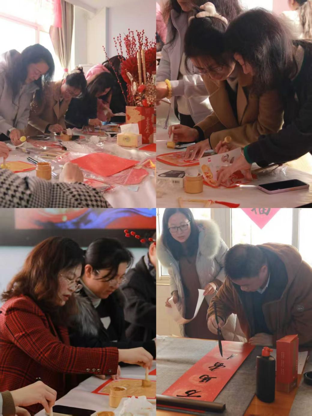 活动现场翰墨飘香,暖意融融。在墨香迎春写春联区域,教职工中的书法爱好者铺纸运笔、挥毫泼墨,一幅幅寓意吉祥的春联在笔锋流转间跃然纸上;于轻罗画韵手绘团扇区域,老师们细心勾勒、专注描摹,或绘骏马奔腾,或染水墨山水,或工笔细刻花鸟,素白团扇顿成意趣盎然的艺术佳作;在墨拓祥年年画拓印区域,大家亲手覆纸、匀力拓印,一幅幅线条古朴、寓意美好的传统年画与字相继呈现。整场活动笑语声声,洋溢着浓郁的文化气息与节日喜悦。