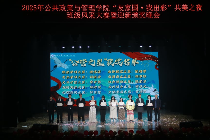 公共政策与管理学院2025“友家国,我出彩”共美之夜班级风采大赛暨迎新颁奖晚会不仅深化了师生情谊与沟通交流,也让公管学子在“友家国”共情凝聚力量,在“我出彩”的表达中实现成长,为学院文化建设与人才培养书写鲜活的时代答卷