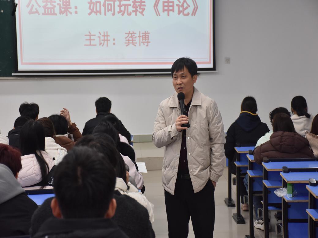 3月6日晚,申论专题讲座如期举行,龚博老师受邀主讲。龚老师从申论命题规律、材料阅读技巧、文章写作框架等方面入手,结合高分范文进行深度解读,指导学生如何精准提炼核心观点、规范作答逻辑。讲座还设置了现场实践环节,让学子们当堂动笔练习、互相交流,在实操中巩固所学,切实提升申论写作能力。