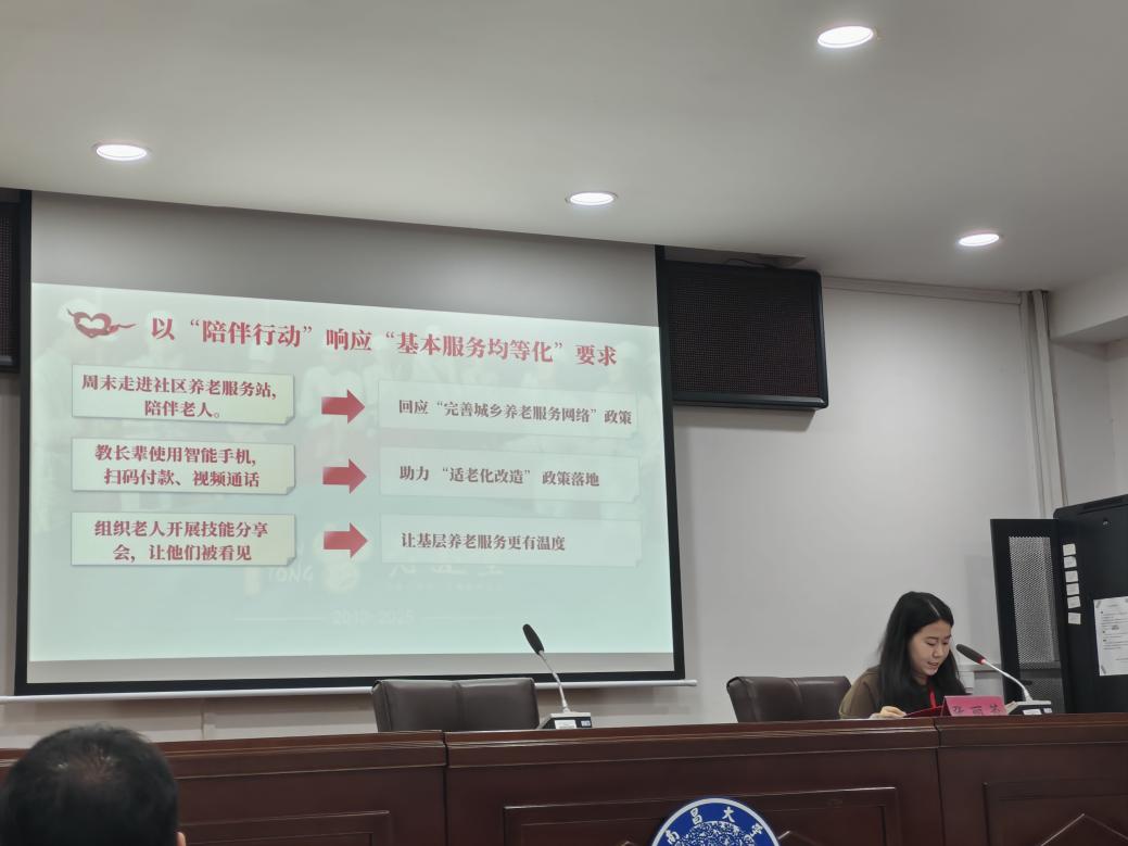 分享中,张丽蓉以“一本影集”为引,生动讲述了南昌大学“老还童”志愿服务项目案例。她从“为何必做”和“如何去做”系统拆解了该项目背后的国家政策部署与志愿者们实践下的青年担当。