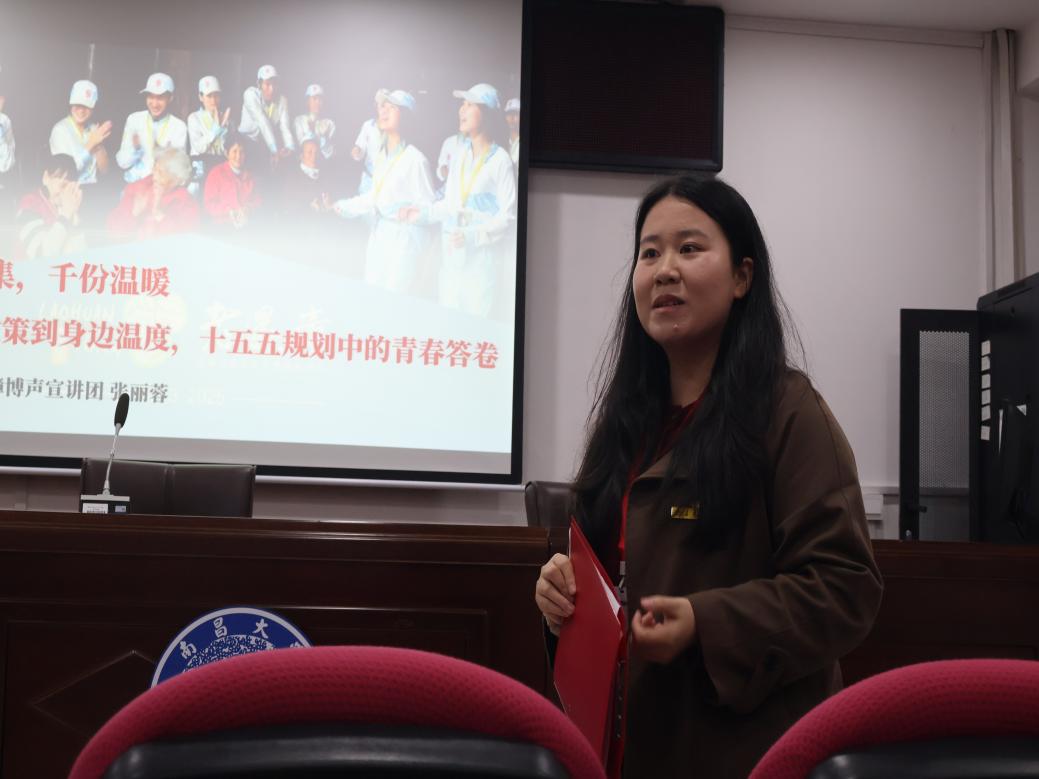 “十五五”规划纲要贯彻落实党的二十届四中全会精神,为未来5年中国经济社会发展绘就了清晰的施工图,提供了科学指引。为深入学习贯彻“十五五”规划精神,引导青年学子坚定理想信念,勇担时代重任,3月27日,南昌大学第16届“前湖研讲”研究生学术文化节第245期“南小研”微讲堂在文法楼A201圆满举行。活动邀请马克思主义学院2025级硕士研究生、“香樟博声”宣讲团讲师张丽蓉担任主讲人,她以“一本影集,千分温暖——从纸上政策到身边温度,十五五规划中的青春答卷”为主题为大家带来一场兼具理论高度和实践温度的深情分享。宣讲吸引了公共政策与管理学院50余位研究生参与,现场氛围热烈。