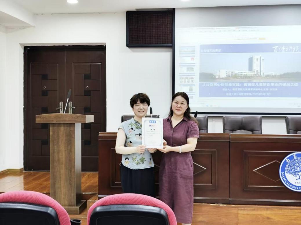 为拓展学生专业视野,探讨公益创业的实践路径,我院于2025年9月11日上午在文法楼A201会议室成功举办了夏季学期主题讲座——“从公益初心到创业实践:孤独症儿童矫正事业的破局之道”。本次讲座由我院心理学系主任李力老师主持,特别邀请到南昌慧中儿童康复训练中心创始人张洁冰老师担任主讲嘉宾。来自应用心理学、社会学等专业的几十名师生参加了此次活动。