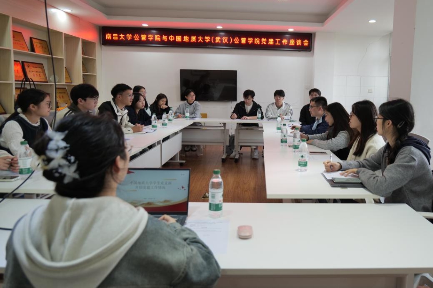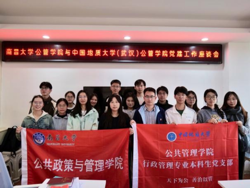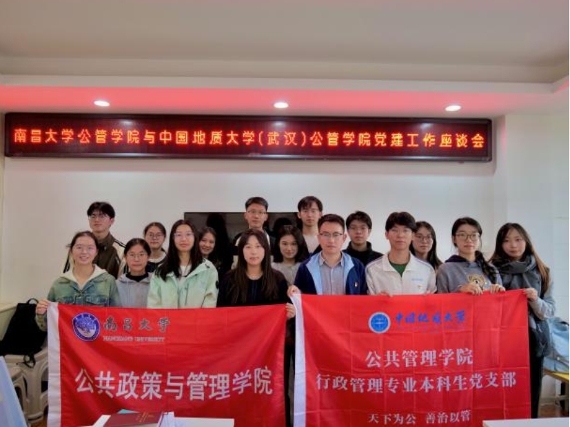 为深入学习贯彻党的二十大精神,扎实推动高校基层党组织建设高质量发展,2025年11月9日,南昌大学公共政策与管理学院研究生第一党支部、本科生第七党支部与中国地质大学(武汉)公共管理学院学生党支部党建工作交流会在南昌大学九栋二楼会议室成功举办。交流会由南昌大学公共政策与管理学院研究生第一党支部尹志杰同志主持,双方围绕党建工作创新、学生党员培养提质、基层组织赋能等核心议题,展开了热烈研讨交流。